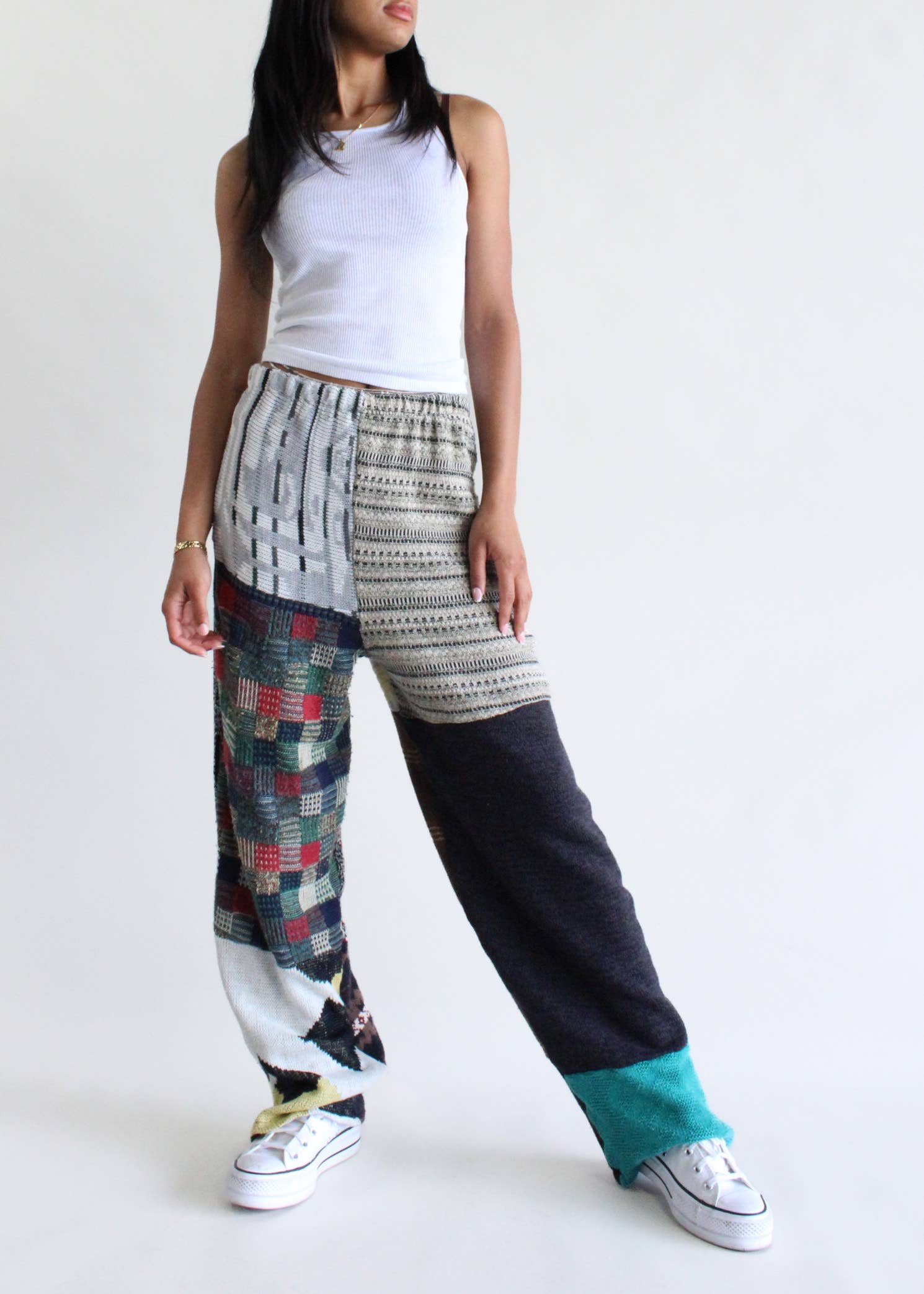 One of a kind! Vintage solid and printed knit sweaters reworked into a patchwork elastic waist pant. Your Pants will include a mix of warm and cool tones and will be similar but not identical to the products shown. Each piece is unique and will come with a one-of-a-kind pattern and color combinations. All RCYCLD waist measurements are measured un-stretched to stretched length lying flat. Length is measured down from the inseam to hem. Rise Mid/ Regular Length 29" -31" SM Waist 25"-31" Hips 37" ML Waist 28"-36" Hips 42"