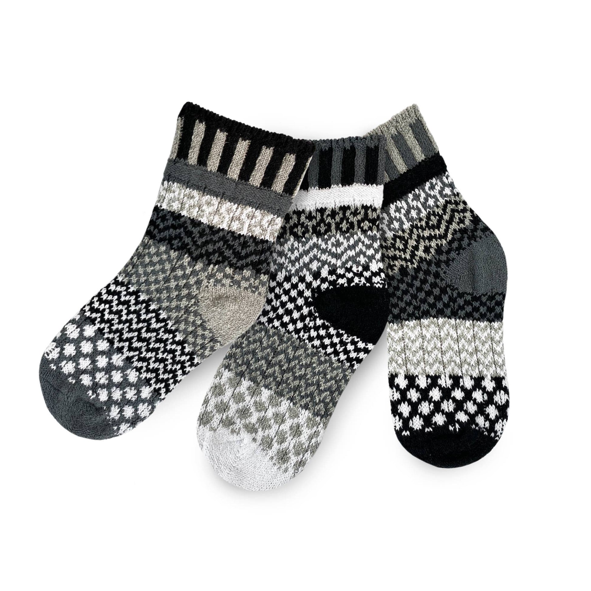 Our Kids Socks come in sets of 3: A pair + 1 spare! These Moonlight Kids Socks are a subtle, but fun way to add some monochromatic style to any outfit! Check out the matching Baby & Adult sets too. Colors in this sock: Black, White, Gray.