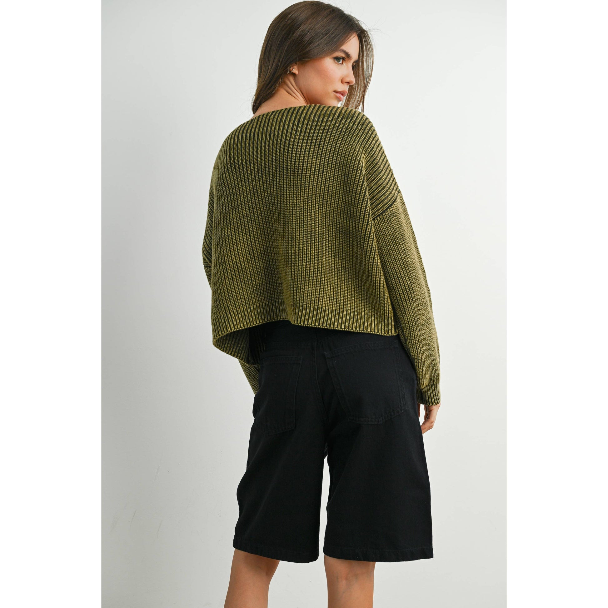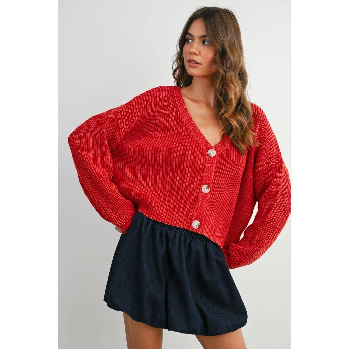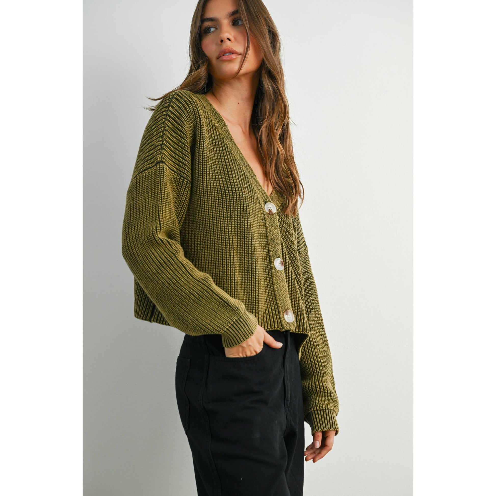V-Neck Buttoned Ribbed Long Sleeve Cardigan - BMC7773
